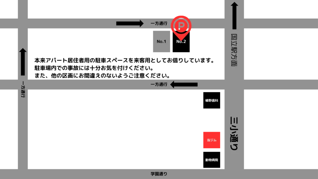 駐車場前の道路は一方通行となっております。ジム前の通り(三小通り)からは直接進入できませんので、迂回をお願いいたします。