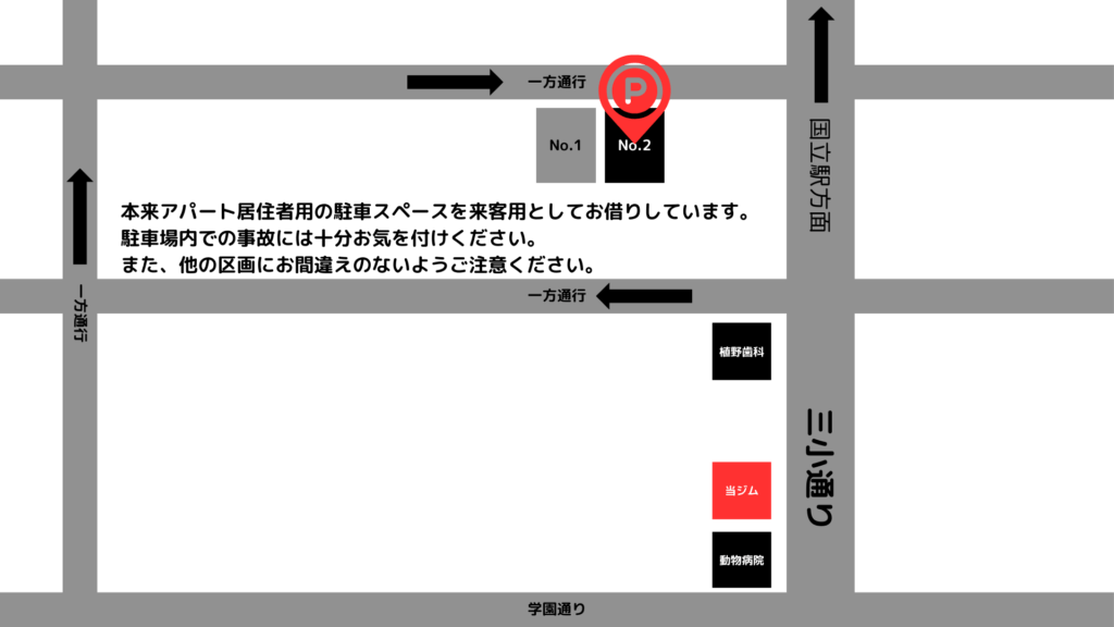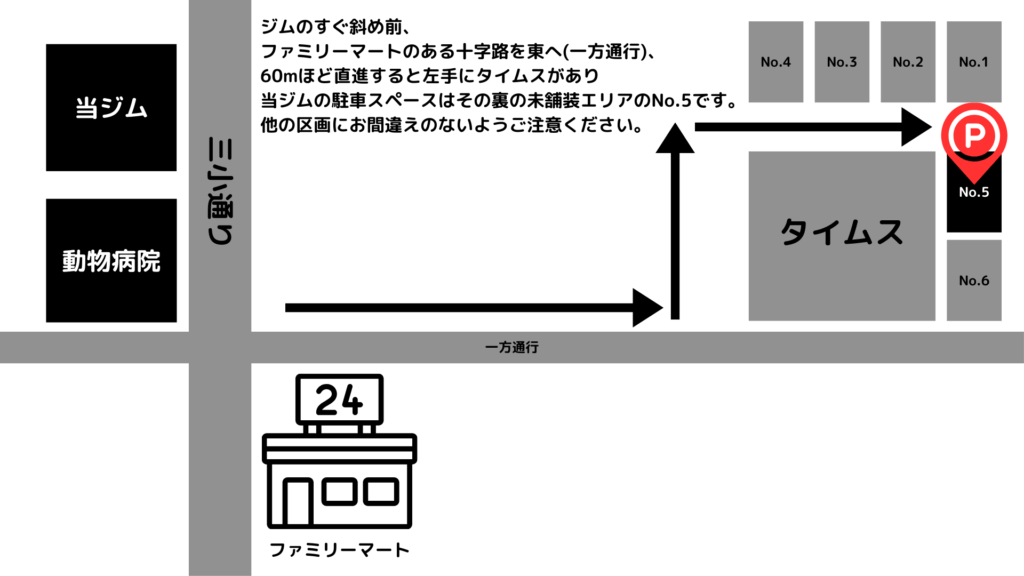 駐車場前の道路は一方通行となっております。ジム前の通り(三小通り)からは直接進入できませんので、迂回をお願いいたします。